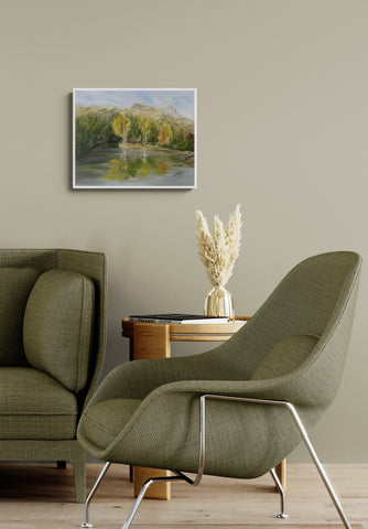 Autumn by the River is an original oil painting on a canvas board, 20" x 16" (~50cm x 40cm). Framed in an inset picture frame.