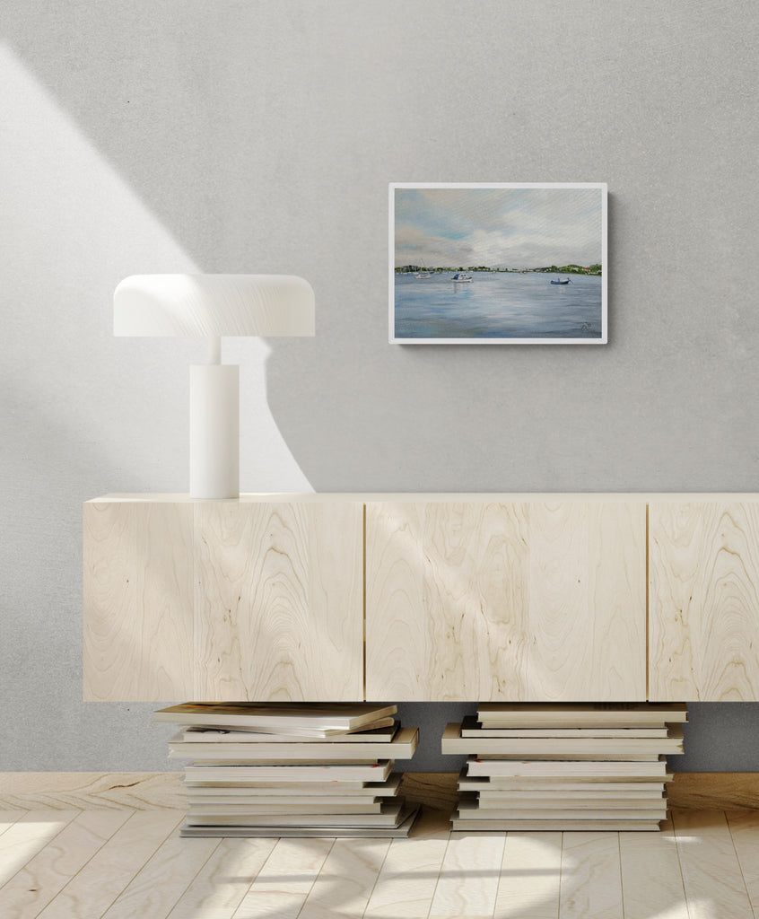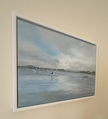 Cloudy Day at Poole Harbour is an original oil painting on stretched canvas 10"x 14".